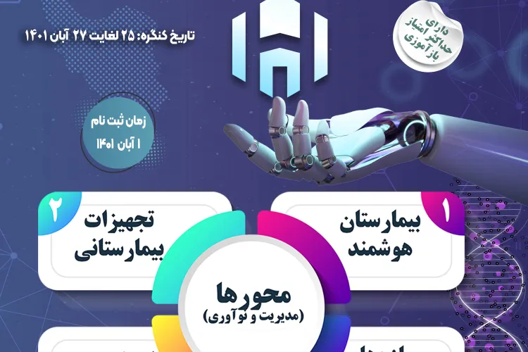با هدف اصلی بهره گیری از توسعه فناوری های جدید حوزه فناوری اطلاعات و ارتباطاتICT ، مهندسی پزشکی، معماری و ساخت بیمارستان در حوزه ی سلامت و ارائه راهکار جامع و یکپارچه بیمارستان هوشمند به عنوان گستره ای جدید در این حوزه ونیز آشنایی با آخرین دستاوردهای علمی،صنعتی و جدیدترین متدهای پژوهشی انجام یافته در حوزه هوشمند سازی بیمارستان ها به همراه کارگاه های جانبی و ارائه تجربه های موفق، در تاریخ ۲۵ لغایت ۲۷ آبان۱۴۰۱ در مرکز بین المللی همایش های رازی-دانشگاه علوم پزشکی ایران، برگزار میگردد. جهت مشاهده پوستر همایش کلیک فرمایید.